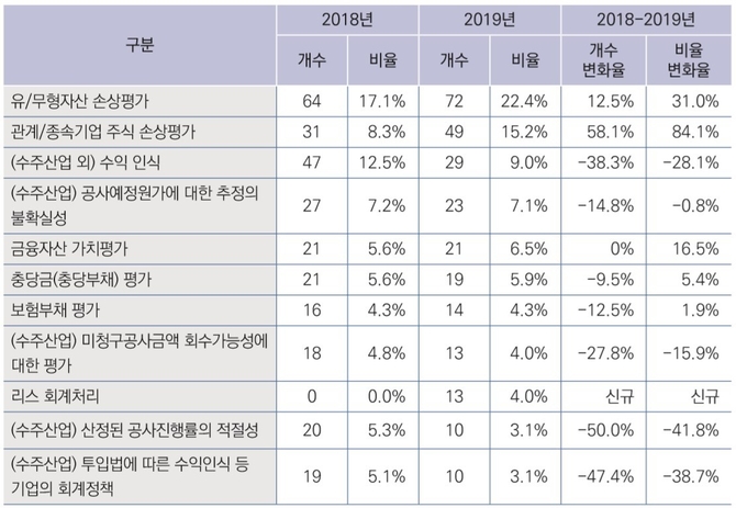 관계·종속기업 주식 손상평가(15.2%)와 수익인식(9.0%)이 각각 뒤를 이었다.