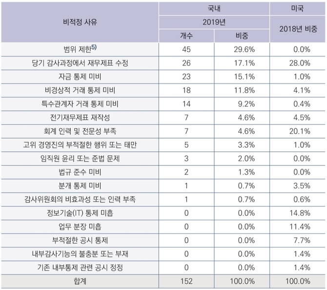 비적정 사유로 ‘재무제표 수정(17.1%)’과 ‘자금 통제 미비(15.1%)’도 높은 비중을 차지했다.