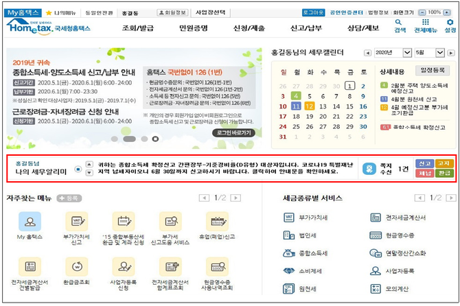 (조세금융신문=고승주 기자) 국세청이 홈택스 접속 시 세무일정 관리 편의성을 높이기 위해 ‘나의 세무알리미’ 서비스를 제공한다고 11일 밝혔다.