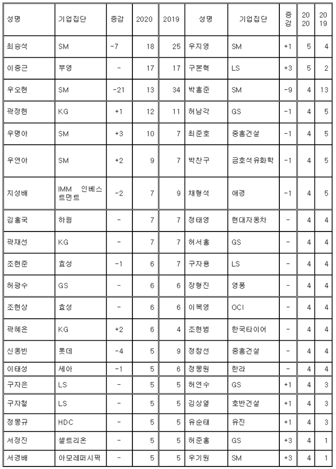 그룹별로는 GS그룹이 16명으로 가장 많았으며 KCC(15명), 애경(11명), 영풍·SM(각 10명) 등의 순이었다. 반면, 미래에셋과 DB그룹은 1명도 없었다.