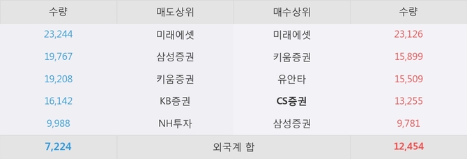 거래원 동향은 CS증권, 미래에셋, 삼성증권 등이 매수 상위 목록에 나타나고 있다.