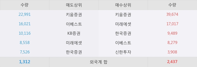 이 시각 주요 거래원은 미래에셋, 키움증권, 한국증권 등이 매수 상위 창구에 자리하고 있다.
