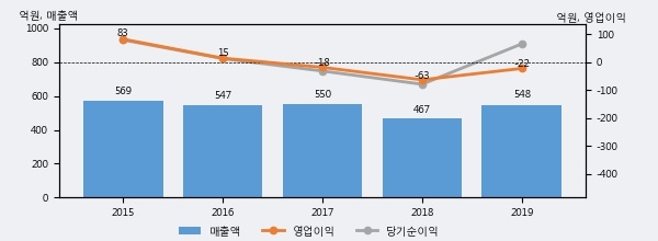동운아나텍의 2019년 매출액은 전년대비 17.3% 늘어난 548억원이고, 영업이익은 전년에 이어 적자가 지속되어 -22억원을 기록했다. 이 회사의 매출액 증감률과 영업이익 증감률은 각각 코스닥 상위 28%, 상위 24%에 해당된다.