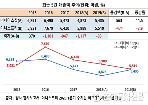양사 감사보고서에 따르면 지난해 매출은 이니스프리가 5519억 원으로 전년도 5989억 대비 7.9% 감소한 반면에 더페이스샵은 11.5% 성장한 5435억 원을 시현, 양사의 매출 격차가 약 83억으로 급격히 축소됐다.