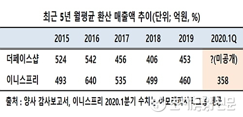 그 근거로 최근 수년간 양사의 월평균 환산 매출 추이를 들고 있다. 특히 지난해의 경우 이니스프리가 2016년 고점을 찍고 매해 내리막길을 걷고 있는 반면에, 더페이스샵은 2018년 406억 원을 저점으로 약 11.5% 증가한 453억 원을 기록하며 반등에 성공한 점을 꼽고 있다.