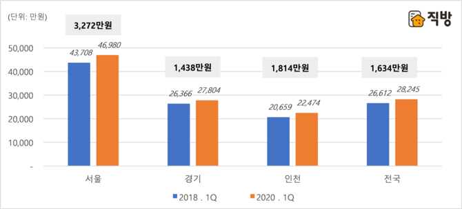 (조세금융신문=이정욱 기자) 서울의 올해 1분기 전세 재계약 비용은 2년 전보다 3200만원 더 오른 것으로 조사됐다. 특히 강남은 7600만원으로 가장 많이 올랐다.