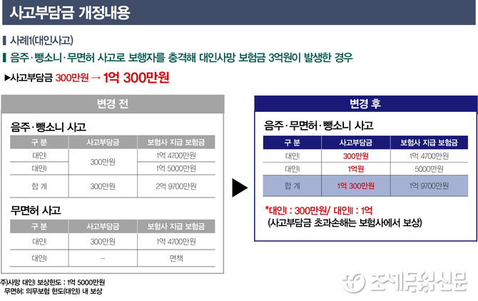 제도 개선을 통해 무면허 가해자는 과거와 달리 300만원에 더해 1억원의 자기부담금을 물어내야 한다. 그 대가로 무면허 가해자는 1억 5000만원을 초과한 인적 피해금액 모두를 보험사 보상을 통해 해결할 수 있게 된다.