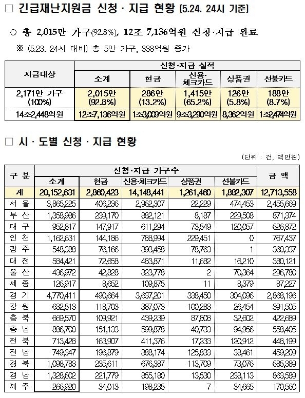 행정안전부는 지난 4일부터 24일까지 지급이 완료된 긴급재난지원금 액수가 총 12조7천136억원, 수령 가구는 2천15만가구로 집계됐다고 25일 밝혔다.