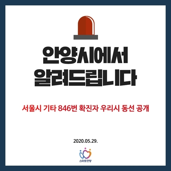 29일 안양시청은 공식 SNS채널을 통해 서울시 기타 846번 확진자가 비산 3동 더그레이스켈리와 인덕원역을 오가는 버스노선을 이용해 22일과 23일, 26일 출퇴근했다고 밝혔다.