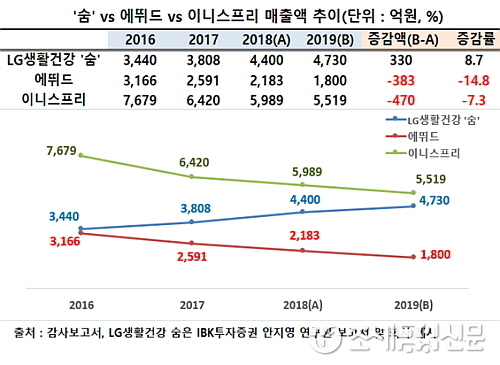 에뛰드 역시 2016년 3166억, 2017년 2591억, 2018년 2183억, 2019년 1800억 원으로 연평균 14.4%씩 외형이 줄어들어, LG생활건강의 단일브랜드인 ‘숨’과 상반된 궤적을 그리고 있다.