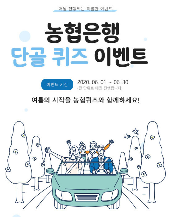 (조세금융신문=진민경 기자) NH농협은행은 농협은행의 모바일 플랫폼인 NH스마트뱅킹과 올원뱅크에서 6월 1일부터 30일까지 한 달간 '6월 농협은행 단골퀴즈 이벤트'를 실시한다고 2일 밝혔다.