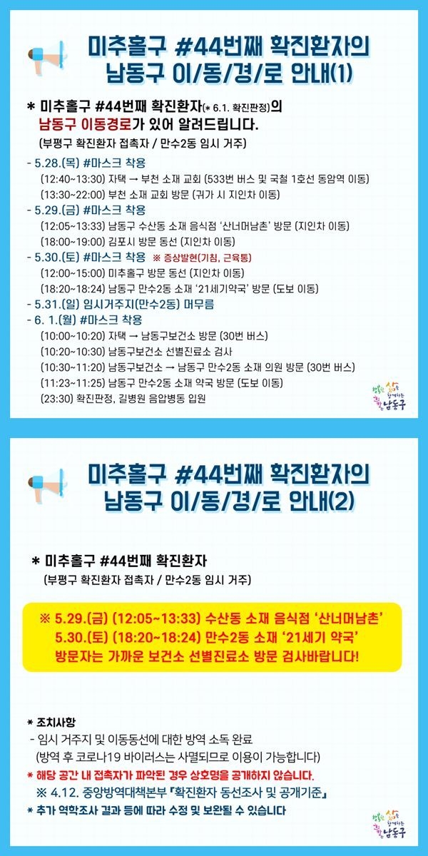 남동구청은 29일 12시 05분부터 13시 33분까지 수산동 소재 음식점 '산너머남촌'과 30일 18시 02분부터 18시 24분 만수2동 소재 '21세기 약국' 방문자에 대해 가까운 보건소 선별 진료소에 방문해 코로나19 검사를 당부했다.