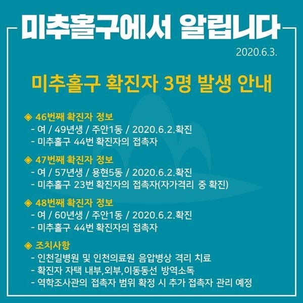 3일 미추홀구청에 따르면 46번 확진자와 48번 확진자는 앞서 발생한 44번 확진자와의 접촉으로 감염됐다.