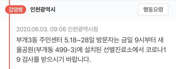 3일 인천광역시 등은 지난 5월 18일부터 28일까지 부개3동 주민센터를 방문한 방문자들은 금일 9시부터 새울공원(부개동 499-3)에 설치된 선별진료소에서 코로나19 검사를 받아달라고 당부했다.