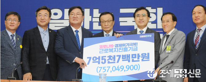 (조세금융신문=김용진 기자) 이해찬 더불어민주당 대표가 3일 오전 국회 당 대표 회의실에서 강순희 근로복지공단 이사장에게 신종 코로나바이러스 감염증(코로나19) 극복 근로복지진흥기금을 전달하고 있다