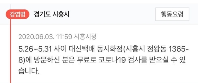 2일 시흥시청 등에 따르면 5월 26일부터 31일까지 '대신택배 동시화점'(시흥시 정왕동 1365-8)에 방문한 사람들은 무료로 코로나 19 검사를 받을 수 있다고 알렸다.
