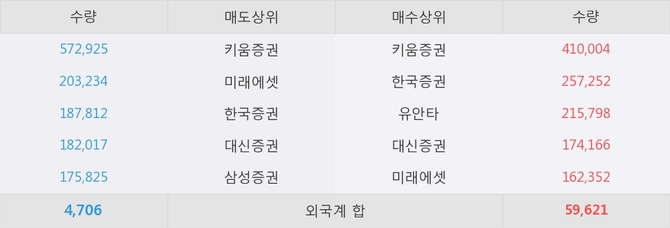 이 시각 주요 거래원은 미래에셋, 키움증권, 한국증권 등이 매수 상위 창구에 자리하고 있다.