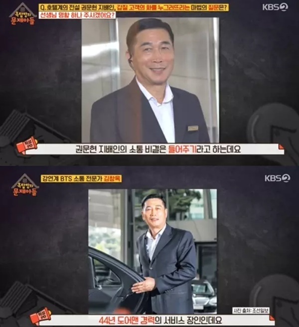 제작진에 따르면 권문현 지배인은 "소통 비결은 들어주기다. 갑질하는 사람들은 자신이 누군지 알아봐주길 바라는데, 그 이야기를 들어주면서 '명함 하나 주시겠어요'라고 물으면 화가 잠재워진다"라고 밝혔다.