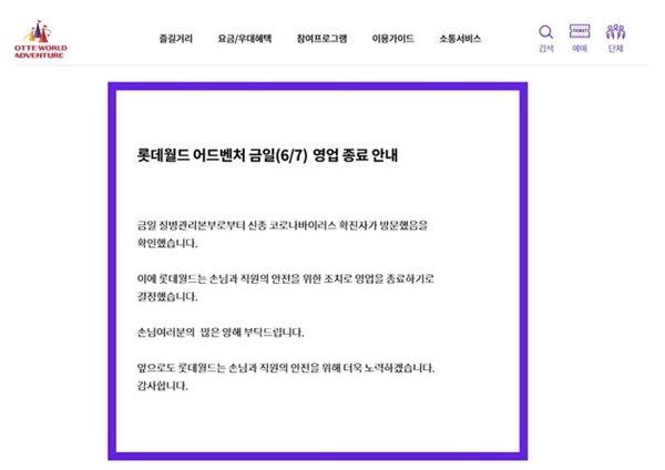 오늘(7일) 롯데월드 측은 코로나 확진자가 다녀간 사실을 인지한 뒤 곧바로 영업 종료를 택해 박수를 받고 있다.