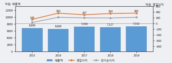 최근 실적을 살펴보면 2019년 매출액이 최근 5년 중 가장 높은 실적을 기록했음을 알 수 있다. 이전 최고 실적이었던 2017년 보다도 1.0%(74억원) 늘어난 것으로 나타났다.