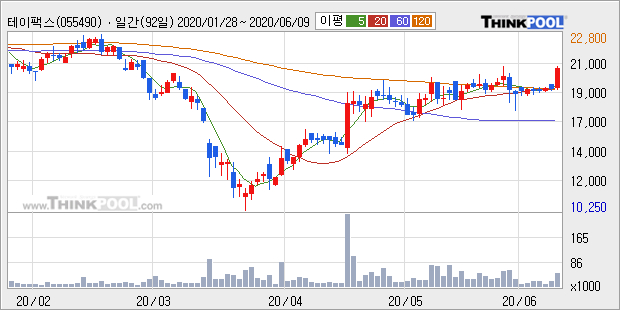 테이팩스의 2019년 매출액은 전년대비 3.8% 늘어난 1126억원이고, 영업이익 또한 전년대비 10.0% 늘어난 83억원을 기록했다. 이 회사의 매출액 증감률과 영업이익 증감률은 각각 코스피 상위 42%, 상위 45%에 해당된다.