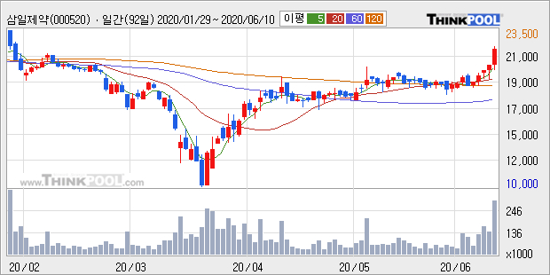 삼일제약은 2019년 매출액 1211억원과 영업이익 48억원을 기록했다. 전년대비 매출은 28.0% 상승했고, 영업이익은 흑자전환했다. 이 회사의 매출액 증감률과 영업이익 증감률은 각각 코스피 상위 10%, 상위 8%에 해당된다.