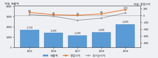 최근 실적을 살펴보면 2019년 매출액이 최근 5년 중 가장 높은 실적을 기록했음을 알 수 있다. 이전 최고 실적이었던 2015년 보다도 31.5%(540억 4천만원) 늘어난 것으로 나타났다.