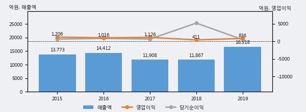 최근 실적을 살펴보면 2019년 매출액이 최근 5년 중 가장 높은 실적을 기록했음을 알 수 있다. 이전 최고 실적이었던 2016년 보다도 14.6%(2106억 1천만원) 늘어난 것으로 나타났다.
