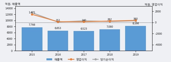 최근 실적을 살펴보면 2019년 매출액이 최근 5년 중 가장 높은 실적을 기록했음을 알 수 있다. 이전 최고 실적이었던 2015년 보다도 5.1%(399억 9천만원) 늘어난 것으로 나타났다.