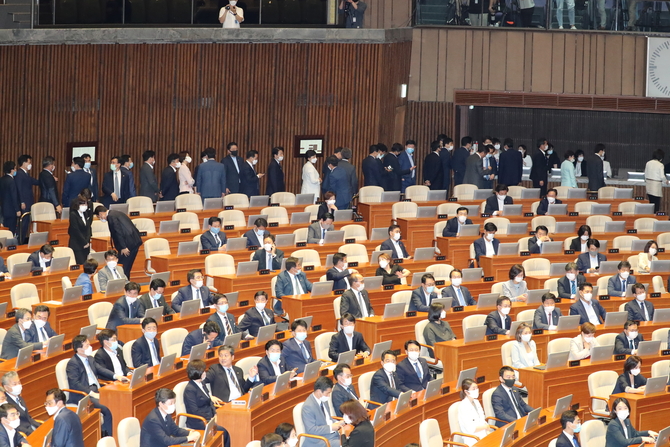 이날 미래통합당은 본회의에 강력히 항의하며 불참했고, 주호영 원내대표만 본회의장에 들어가 의사진행 발언을 통해 항의표시를 했다.
