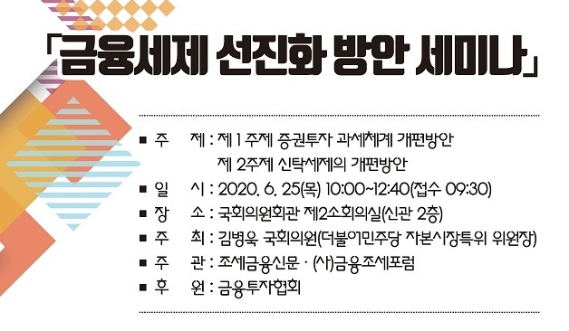 (조세금융신문=진민경 기자) 조세금융신문은 6월 25일 10시부터 국회의원회관 제2소회의실에서 금융조세포럼과 공동으로 ‘금융세제 선진화 방안’이란 주제로 세미나를 개최한다.