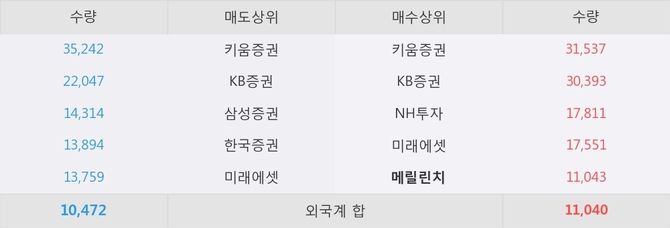 거래원 동향은 메릴린치, NH투자, 미래에셋 등이 매수 상위 목록에 나타나고 있다.