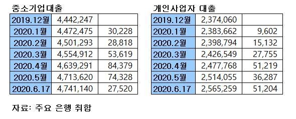 올해 들어 증가 폭은 19조1천199억원에 달한다. 5월 말부터 이달 17일까지 3주가 안 되는 기간에 5조원이 넘게 늘어났다. 개인사업자 대출 잔액이 2018년 12월 말에서 작년 6월 말 사이에 7조7천억원 늘어난 것을 고려하면 올해 비슷한 기간에 증가 폭이 2배를 넘어섰다.
