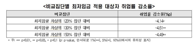 그 결과 새로 최저임금 적용 대상이 된 집단의 취업률 감소폭이 다른 집단보다 큰 것으로 나타났다. 최저임금보다 30%를 더 받는 집단에 비해서는 4.6%포인트나 더 감소했고, 50%를 더 받는 집단과 비교해도 4.5%포인트나 취업률 감소율이 높았다.