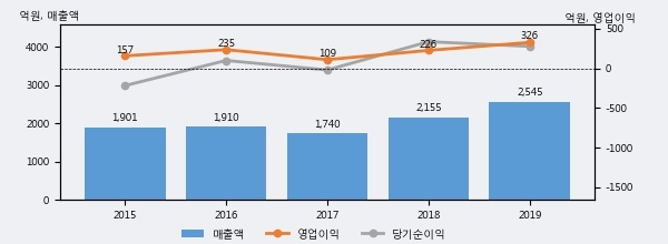 최근 실적을 살펴보면 2019년 매출액이 최근 5년 중 가장 높은 실적을 기록했음을 알 수 있다. 이전 최고 실적이었던 2018년 보다도 18.1%(390억 1천만원) 늘어난 것으로 나타났다.
