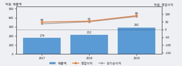 최근 실적을 살펴보면 2019년 매출액이 최근 3년 중 가장 높은 실적을 기록했음을 알 수 있다. 이전 최고 실적이었던 2018년 보다도 37.2%(79억 1천만원) 늘어난 것으로 나타났다.