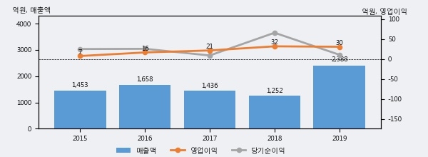 최근 실적을 살펴보면 2019년 매출액이 최근 5년 중 가장 높은 실적을 기록했음을 알 수 있다. 이전 최고 실적이었던 2016년 보다도 44.0%(730억 1천만원) 늘어난 것으로 나타났다.