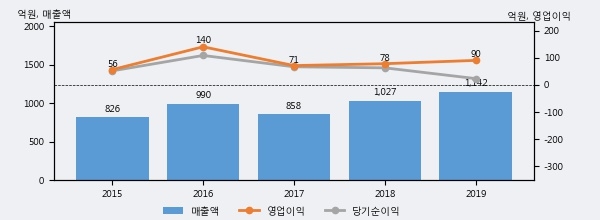 최근 실적을 살펴보면 2019년 매출액이 최근 5년 중 가장 높은 실적을 기록했음을 알 수 있다. 이전 최고 실적이었던 2018년 보다도 11.2%(115억 2천만원) 늘어난 것으로 나타났다.