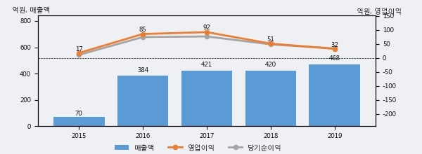 최근 실적을 살펴보면 2019년 매출액이 최근 5년 중 가장 높은 실적을 기록했음을 알 수 있다. 이전 최고 실적이었던 2017년 보다도 11.2%(47억 2천만원) 늘어난 것으로 나타났다.