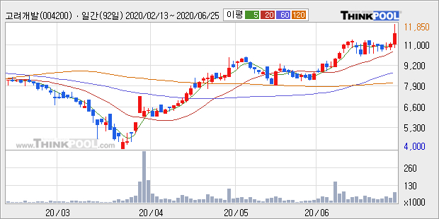 고려개발의 2019년 매출액은 6849억으로 전년대비 23.6% 상승했고, 영업이익 또한 631억으로 전년대비 57.9% 상승했다. 이 회사의 매출액 증감률과 영업이익 증감률은 각각 코스피 상위 12%, 상위 25%에 해당된다.