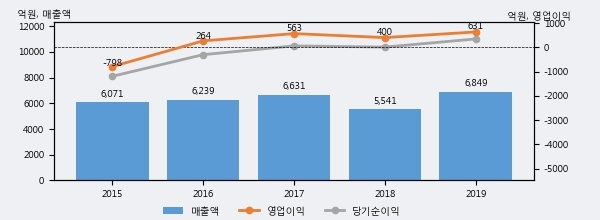 최근 실적을 살펴보면 2019년 매출액이 최근 5년 중 가장 높은 실적을 기록했음을 알 수 있다. 이전 최고 실적이었던 2017년 보다도 3.3%(218억 4천만원) 늘어난 것으로 나타났다.