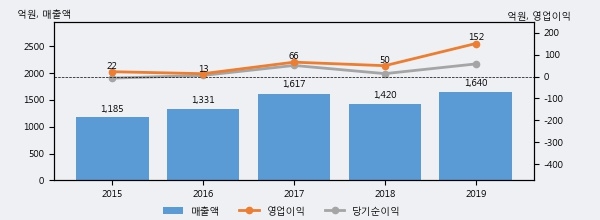 최근 실적을 살펴보면 2019년 매출액이 최근 5년 중 가장 높은 실적을 기록했음을 알 수 있다. 이전 최고 실적이었던 2017년 보다도 1.4%(22억 9천만원) 늘어난 것으로 나타났다.