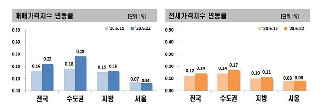 한국감정원은 6월 넷째 주(22일 기준) 전국의 주간 아파트값이 0.22% 상승했다고 25일 밝혔다. 이는 전주 상승률 0.16%보다 오름폭이 커진 것이다.
