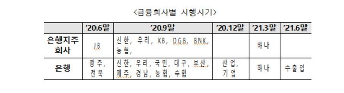 올해 6월 말 광주·전북은행, JB금융지주를 시작으로 9월 말에는 신한·우리·국민·대구·부산·제주·경남·농협·수협은행, 신한·우리·KB·DGB·BNK·농협금융지주가 조기 적용 대상에 추가된다.