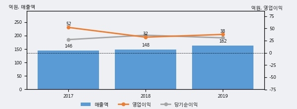 최근 실적을 살펴보면 2019년 매출액이 최근 3년 중 가장 높은 실적을 기록했음을 알 수 있다. 이전 최고 실적이었던 2018년 보다도 9.4%(14억원) 늘어난 것으로 나타났다.