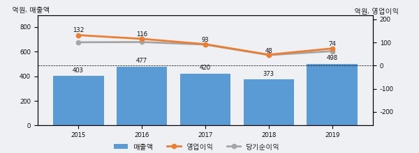 최근 실적을 살펴보면 2019년 매출액이 최근 5년 중 가장 높은 실적을 기록했음을 알 수 있다. 이전 최고 실적이었던 2016년 보다도 4.3%(20억 7천만원) 늘어난 것으로 나타났다.