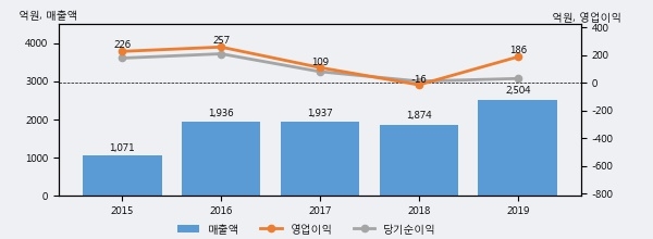 최근 실적을 살펴보면 2019년 매출액이 최근 5년 중 가장 높은 실적을 기록했음을 알 수 있다. 이전 최고 실적이었던 2017년 보다도 29.3%(567억원) 늘어난 것으로 나타났다.