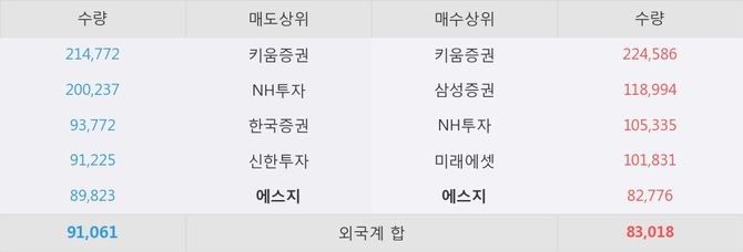 거래원 동향은 에스지, 삼성증권, NH투자 등이 매수 상위 목록에 나타나고 있다. 한편, 매도 창구 상위에는 에스지가 눈에 띄고 있다.