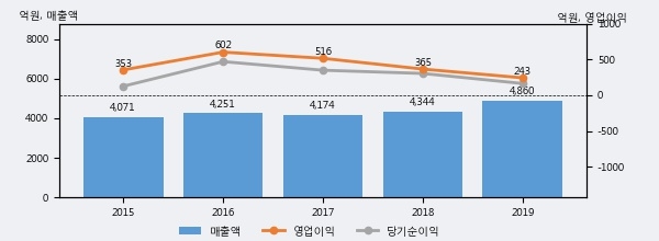 최근 실적을 살펴보면 2019년 매출액이 최근 5년 중 가장 높은 실적을 기록했음을 알 수 있다. 이전 최고 실적이었던 2018년 보다도 11.9%(516억 4천만원) 늘어난 것으로 나타났다.