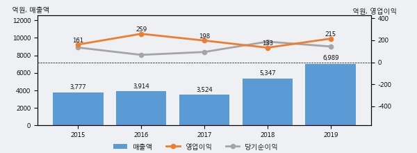 최근 실적을 살펴보면 2019년 매출액이 최근 5년 중 가장 높은 실적을 기록했음을 알 수 있다. 이전 최고 실적이었던 2018년 보다도 30.7%(1642억 2천만원) 늘어난 것으로 나타났다.